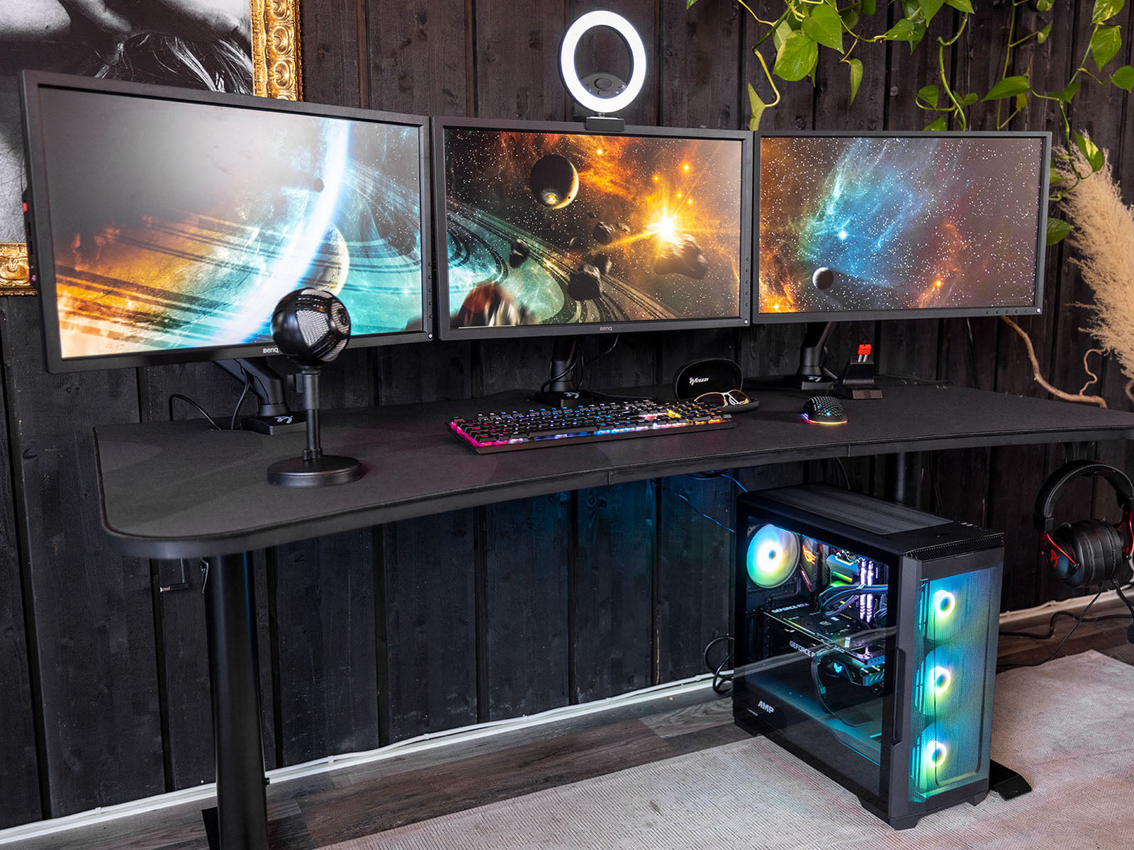 Arena Gaming Deskは、高さを最大10cmまで調節できる頑丈なスチール脚で支えられています。六角レンチを使用して脚を固定し、安定性を高めます。また、脚の下にはバランス調整ノブが4つ付いており、デスクのぐらつきを防ぎ、個人の環境に合わせた調整ができます。
